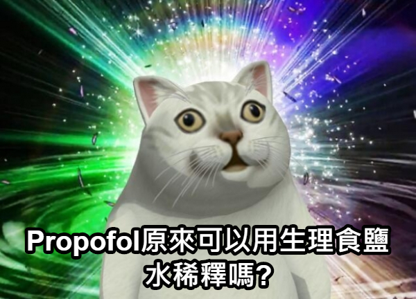 之前曾經提過propofol慢慢推可以減少呼吸抑制甚至減少導入所需劑量,不過當遇到體重小於3kg的小狗小貓時,不知道大家有沒有覺得這時候要一次慢慢推一點點變得非常困難,這邊有個簡單的小訣竅,可以將propofol用生理食鹽水1:1稀釋一倍,就可以用更精準的劑量緩慢手動推注propofol!(alfaxan也是可以稀釋的)不過看到這邊或許有些人會出現幾個小疑問